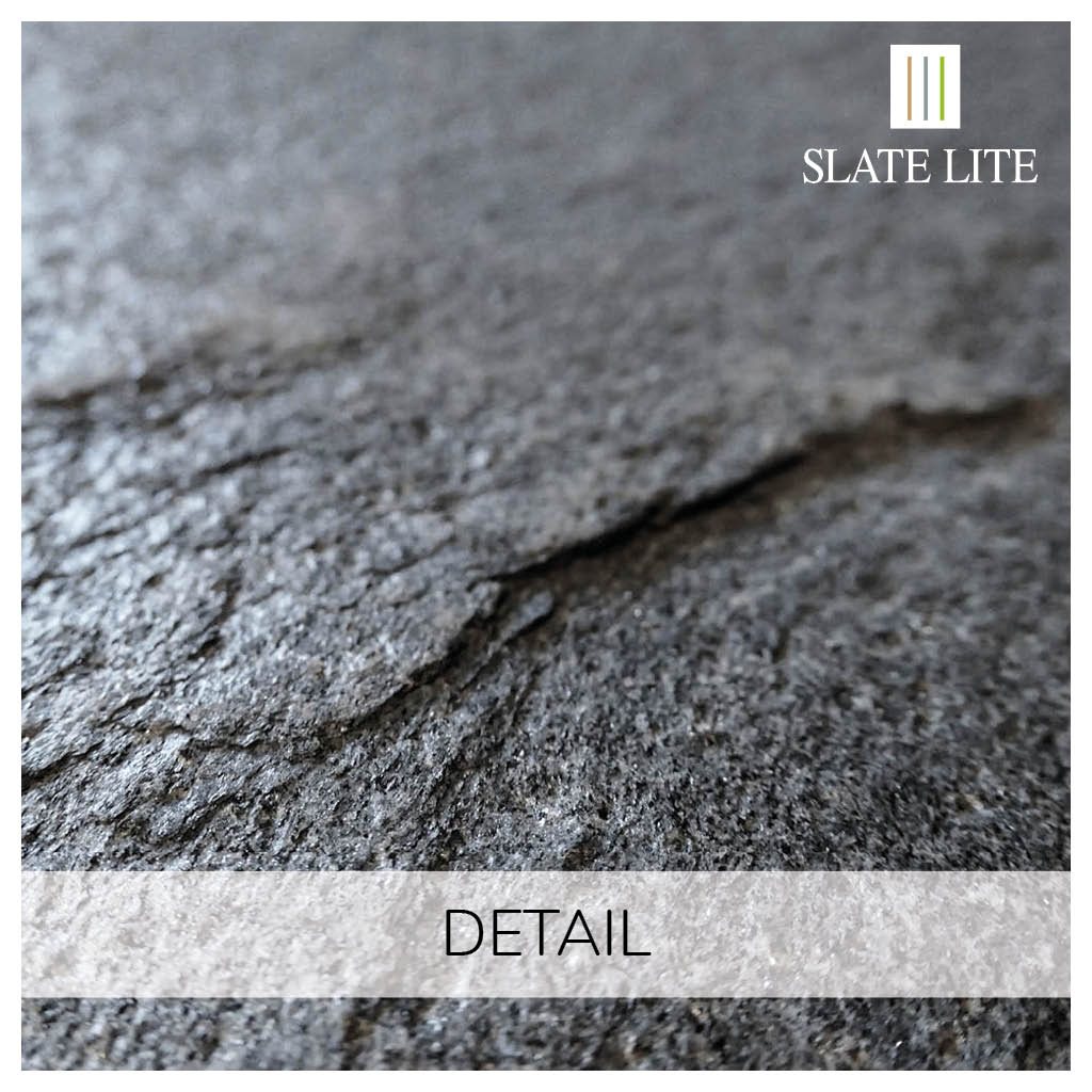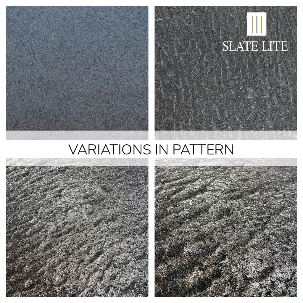 Slate Lite wird aus Naturstein hergestellt. Abweichungen in Farbe und Muster sowie Quarzadern und natürliche Steinspaltungen sind kein Nachteil, sondern ein charakteristisches Merkmal der Natur.