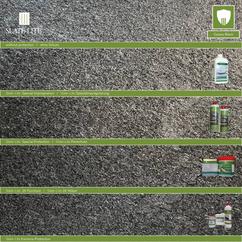 Im Unterschied zu unserem herkömmlichen GALAXY BLACK fehlen hier zusätzliche Rosttöne und ermöglichen somit der homogenen, nahezu musterlosen Steinstruktur, ihren sanften Glitzereffekt ohne jegliche Störungen zur Geltung zu bringen.