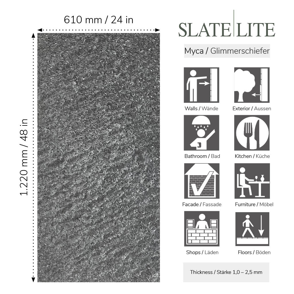 Die Glimmerschiefer-Dekore zeichnen sich normalerweise durch eine etwas rauere Oberfläche und homogene Muster aus. Besonders auffällig ist der glänzende Effekt, der durch den natürlichen Quarzit-Anteil im Gestein entsteht.