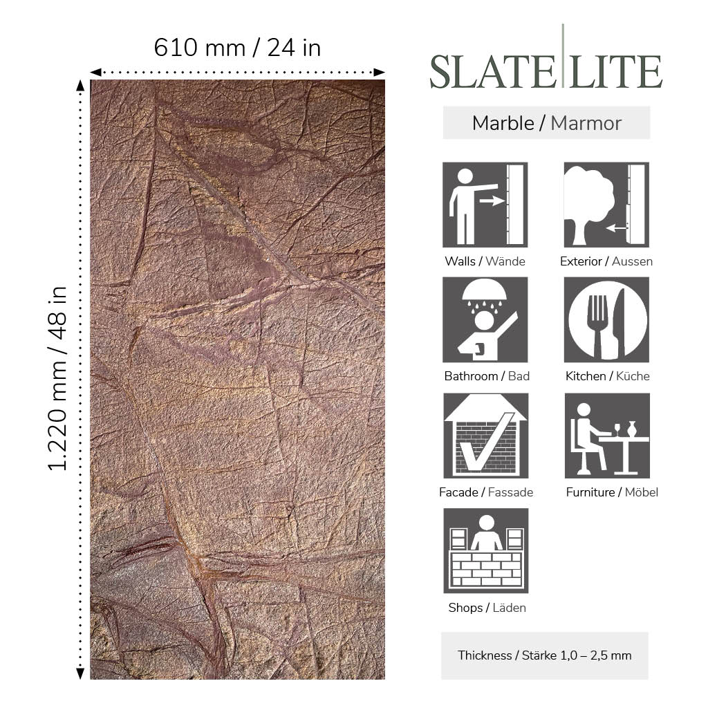 Die Marmor-Dekore zeichnen sich durch ihre raue Oberfläche aus, die mit verschiedenen und kontinuierlich wechselnden Mustern und Strukturen beeindruckt. Eine markante Eigenschaft ist das Vorhandensein von starken Maserungen und Erhebungen auf der Oberfläche. Es ist wichtig zu beachten, dass die Marmore eine raue Spaltung aufweisen und teilweise Strukturen mit erhöhter Gesamtstärke sowie eine insgesamt höhere Spannung im Material aufzeigen.