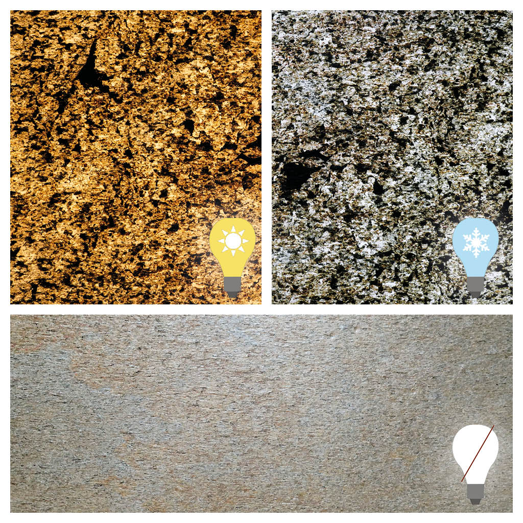 Die Glimmerschiefer-Dekore zeichnen sich normalerweise durch eine etwas rauere Oberfläche und homogene Muster aus. Besonders auffällig ist der glänzende Effekt, der durch den natürlichen Quarzit-Anteil im Gestein entsteht.