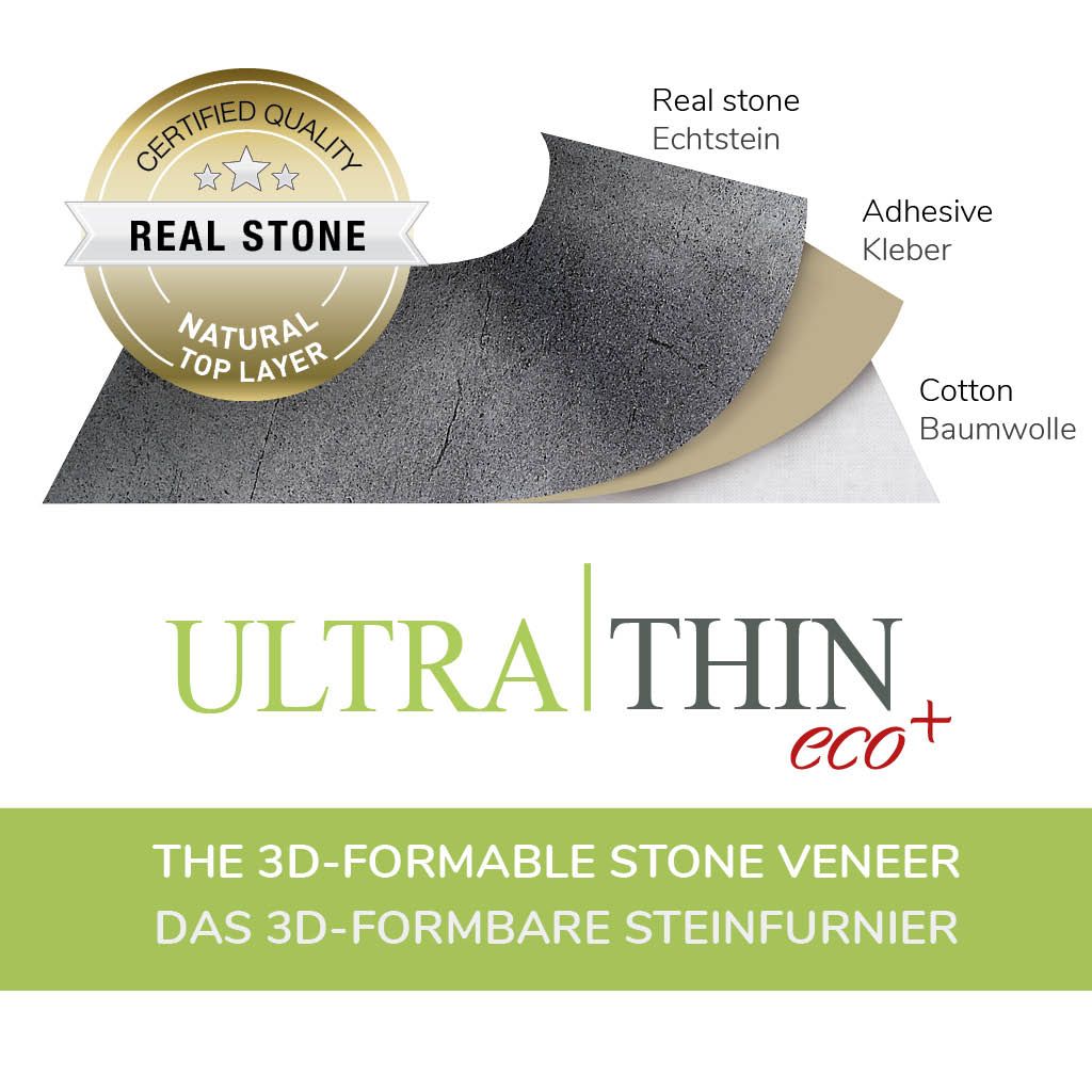 UltraThin eco+ wird aus Naturstein hergestellt. Abweichungen in Farbe und Muster sowie Quarzadern und natürliche Steinspaltungen sind kein Nachteil, sondern ein charakteristisches Merkmal der Natur.